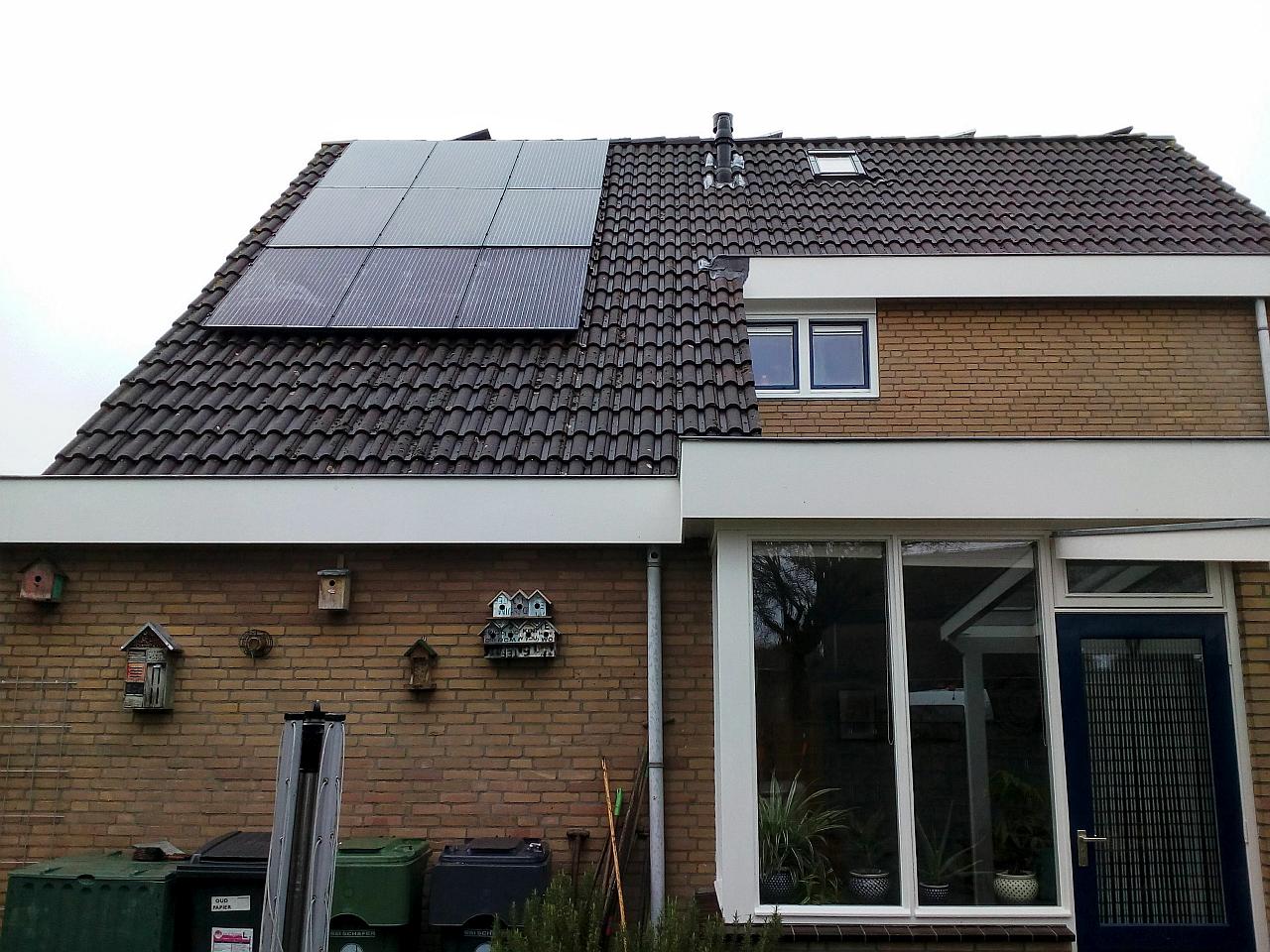 Op maandag 8 februari 2016 heeft Bongo Solar de installatie geplaatst en aangesloten. De panelen produceerden onder de betrokken lucht meteen stroom, ondanks afwezigheid van de zon. We zijn blij met de toevoeging van deze duurzame energietoepassing aan onze woning!